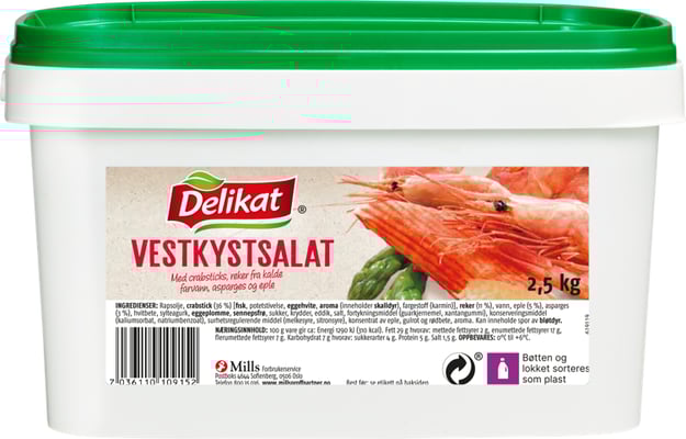 Rapsolje, surimi (36 %) [ fisk, potetstivelse, eggehvite, aroma (inneholder skalldyr),fargestoff (karmin)] reker (11 %), vann, eple (5 %), asparges (3 %), hvitbete, sylteagurk, eggeplomme, sennepsfrø, sukker, krydder, eddik, salt, fortykningsmiddel (guarkjernemel, xantangummi), konserveringsmiddel (kaliumsorbat, natriumbenzoat), surhetsregulerende middel (melkesyre, sitronsyre), fargestoff (karmin), aromaProsesseringsanalyse