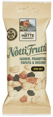 Posen består av en rikelig mengde røstede cashewnøtter og peanøtter som sammen med søt tørket papaya og rosiner gir en fyldig og god smak.