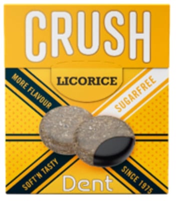 Dent Crush u/Sukker Licorice 25g fra Dent er et produkt innen Snacks & godteri, Pastiller. Produktet er tilgjengelig hos Joker til en pris av 22.90 kr. Vekten er 25 g. Produktet leveres av Brynild as. Produktet ble første gang registrert 9.1.2022 og sist oppdatert 6.10.2023. Prisen har holdt seg stabil på 22.90 kr.