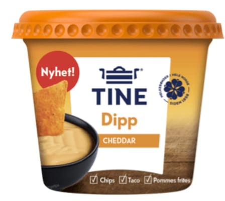 TINE® Dipp Cheddar er ferdigblandet dipp laget av Crème Fraîche med 10 % fett og med smak av cheddar. Passer perfekt til chips, taco og pommes frites.