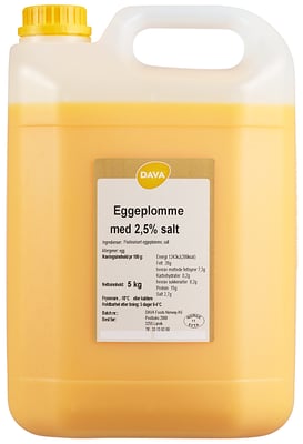 Eggeplomme med 2.5% Salt 5kg Vekten er 5 kg. Produktet inneholder følgende allergener: Egg. Produktet leveres av DAVA FOODS NORWAY AS. Produktet ble første gang registrert 11.6.2023 og sist oppdatert 6.9.2023.