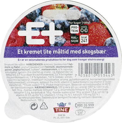 Energi Måltid Skogsbær 100g Tine fra TINE Vekten er 100 g. Produktet inneholder følgende allergener: Melk. Produktet leveres av TINE SA. Produktet ble første gang registrert 11.6.2023 og sist oppdatert 6.9.2023.