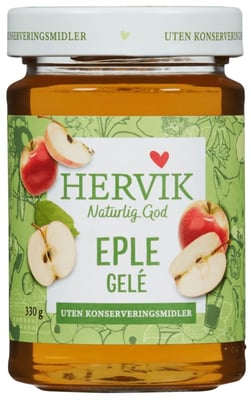Søt og mild eplegelé. Kan brukes til kaker, på brødskive og til ost. Hervik gelé inneholder mye frukt og ingen konserveringsmidler. På denne måten får du mye av de gode og naturlige råvarene uten at uønskede konserveringsmidler følger med. Dette forklarer også den naturlig gode smaken.