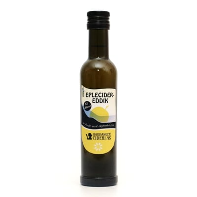 Vår eplesider-eddik er en 8 % eddik laget av ekte "sider frå Hardanger". Ingen tilsetninger