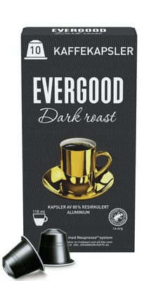 Kaffekapsel som er kompatibel med Nespresso®systemet. Evergood Kaffe består av en nøye utvalgt blanding av 100% Arabica-bønner. I frodige fjellområder høyt over havet, finnes det unike klimaet som modner kaffeplantens bønner langsomt. Slik får den fyldige, aromatiske smaksrikdommen som kjennetegner Evergood Kaffe tid til å utvikle seg. Evergood Kaffe er sertifisert av Rainforest Alliance. Rainforest Alliance er en internasjonal organisasjon som jobber for å bevare biologisk mangfold og bærekraftig livsgrunnlag. Sertifiseringsordningen til Rainforest Alliance garanterer at råvarene er produsert under verdige og miljøvennlige forhold. Les mer på www.ra.org.