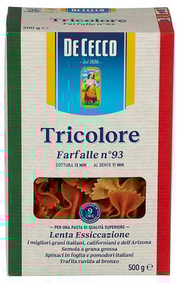 Farfalle Tricolore 500g De Cecco fra De Cecco er et produkt innen Middag, Pasta, Pastafigurer. Vekten er 500 g. Produktet inneholder følgende allergener: Gluten. Produktet leveres av OLUF LORENTZEN AS. Produktet ble første gang registrert 11.6.2023 og sist oppdatert 6.9.2023.