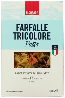 Farfalle Tricolore 500g Eldorado fra Eldorado er et produkt innen Middag, Pasta, Pastafigurer. Produktet er tilgjengelig hos Meny til en pris av 28.90 kr. Vekten er 500 g. Produktet inneholder følgende allergener: Gluten. Produktet leveres av Unil. Produktet ble første gang registrert 9.1.2022 og sist oppdatert 5.10.2023. Prisen har holdt seg stabil på 28.90 kr.