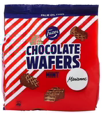 socker, fullhärdat vegetabiliskt fett (kokos), vetemjöl/hvedemel, skummjölkspulver/skummetmælkspulver, kakaosmör, kakaomassa, fettreducerat kakaopulver, vasslepulver (av mjölk)/vallepulver (fra mælk)/mysepulver (fra melk), mjölkfett/mælkefedt/melkefett, rapsolja, emulgeringsmedel (sojalecitin), salt, jäsningsmedel/hævemidler (natriumkarbonat, ammoniumkarbonat), aromer (bl.a. pepparmintolja)