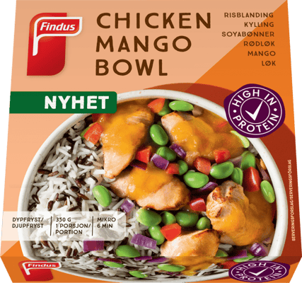 Findus Chicken Mango Bowl 350g fra FINDUS er et produkt innen Middag, Ferdigmåltider, Ferdigmåltid. Produktet er tilgjengelig hos Coop til en pris av 56.90 kr. Produktet inneholder følgende allergener: Soya. Produktet leveres av FINDUS NORGE AS. Produktet ble første gang registrert 15.7.2022 og sist oppdatert 16.7.2023. Prisen har holdt seg stabil på 56.90 kr.