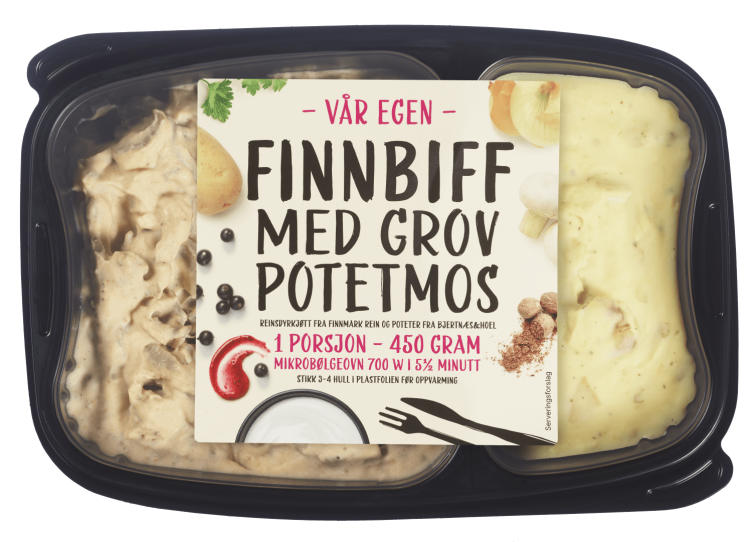 En klassisk finnbiff gryte med sopp, løk fløte. Fyldig og kremet smak, sødme fra solbærsirup, slik det skal være. Tilbehør er en grov potetstappe med skall. Masse smak av nydelige Bertnes og Hoel mandelpoteter og smør