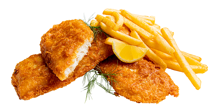 Renskårne fileter av Alaska pollock * (Theragra chalcogramma) 53 % FISK, hvetemel, mineraler (kalcium, jern), vitaminer (niacin, tiamin)], solsikkeolje, vann, rapsolje, palmeolje, hvetestivelse, salt, maismel, bakepulver (E450, E500, E503), maismel, sennep, sennepspulver, druesukker, chillipepper, hvetegluten, skummetmelkpulver, farvestoffer (gurkemeje, paprikaekstrakt), krydder 8bl.a. chili) og stabiliseringsmiddel (E464).