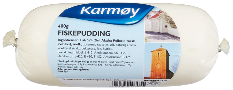 Fiskepudding 400g Rund Karmøy fra Karmøy Vekten er 0.4 kg. Produktet inneholder følgende allergener: Egg, Fisk, Melk. Produktet leveres av DOMSTEIN SJØMAT AS. Produktet ble første gang registrert 11.6.2023 og sist oppdatert 6.9.2023.