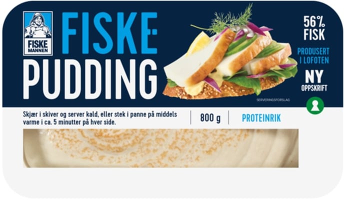 Formstekt fiskepudding. Produsert i Lofoten, av norsk fisk.