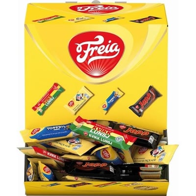 Et utvalg Freia minis sjokolade samlet i en boks. I boksen finner du hele 64 stykk Freida melkesjokolade, 70 stykk Kvikklunsj, 50 stykk Toppris og 40 stykk med Japp! Stor kartong på nesten seks kilo fullstappet med Freia sjokolade.Trykk her for mer inform