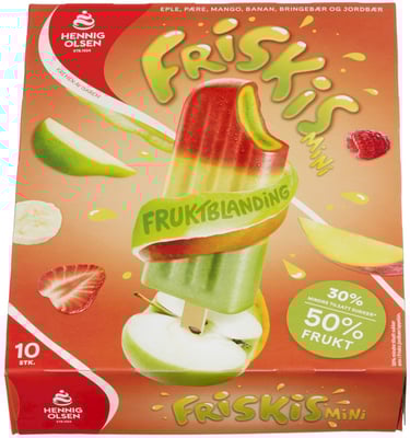 Friskis Fruktblanding er fruktis med 50 prosent frukt og friske smaker av mango, banan, eple, pære, bringebær og jordbær. Et litt fruktig og lekent alternativ. Passende for veganere.
