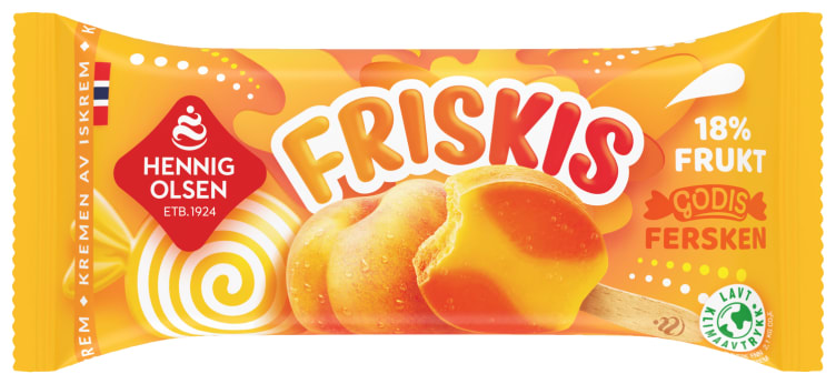 Friskis Fersken er en fruktis med ferskensmak med friskt fruktisovertrekk.