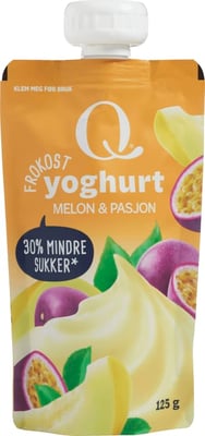 "Q Frokostyoghurt Melon & Pasjon i små porsjonspakninger er perfekt i matpakken eller på farten. Den smakfulle hverdagsyoghurten har 30 % mindre sukker* enn vanlig fruktyoghurt, helt uten kunstig søtning og laktoseredusert. Ganske enkelt bedre! *Sammenlignet med gjennomsnittlig sukkerinnhold i fruktyoghurter med tilsatt sukker."
