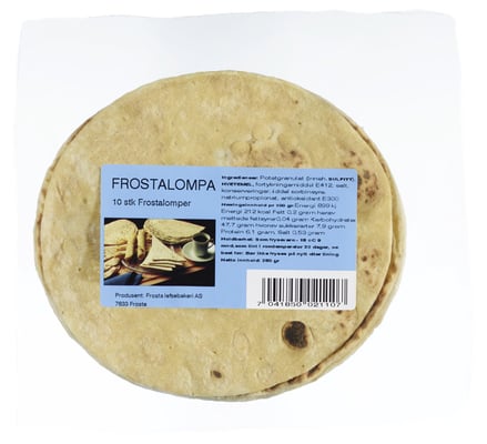 Frostalompa fra Frosta Vekten er 250 g. Produktet inneholder følgende allergener: Gluten, Sulfitt. Produktet leveres av FROSTA LEFSEBAKERI AS. Produktet ble første gang registrert 11.6.2023 og sist oppdatert 6.9.2023.