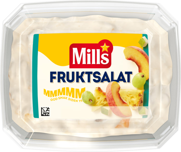 Mills Fruktsalat med nydelig solmoden frukt; fersken, pære, ananas, epler og druer. Frisk og god på brødskiven eller til kylling. Mills salater produseres i Drammen.