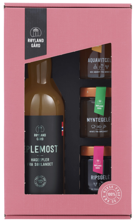 En perfekt gavepakke å gi til noen du er glad i fra Røyland Gård. Opplev den rene, forfriskende smaken av norsk natur med eplemost og tre geleer av rips, mynte og aquavit. Røyland håndplukker de beste norske råvarene for å gi deg den autentiske smaken av Norge. Eplemosten er laget av hageepler fra Sørlandet, server den gjerne som et alkoholfritt alternativ til de gode middagene. Geleene er nydelige som smaksforsterkere til middagsretter av både storfe, vilt, lam og fisk, i tillegg til ost. Produktene er uten konserveringsmidler, rørsukkeret og krydderet som benyttes er økologisk. Pernille og Gunnar ønsker å dele sin lidenskap for ekte norsk matkultur, og håper å inspirere til uforglemmelige måltider.