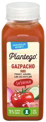 Plantego Gazpacho RØD er en drikkeklar kald suppe laget av hovedsakelig tomater, agurk, løk og hvitløk. Produktet er 100% plantebasert, og er et fargerikt og smakfullt mellommåltid. Produktet kommer på 250 ml plastflaske, flasken kan pantes.