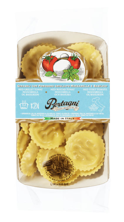 Fersk, italiensk eggpasta av høy kvalitet, fylt med grillede tomater, basilikum, mozzarella og Grana Padano.