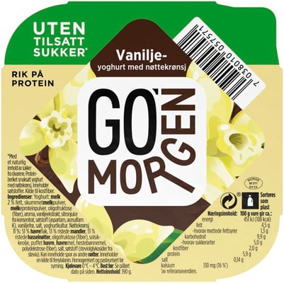 Go'morgen® Yoghurt er et smart lite måltid som smaker godt, metter raskt og gir deg energi når du trenger det. Go'morgen® UTEN kommer i flere smaksvarianter med müslikrønsj i sidebegeret, og er helt uten tilsatt sukker. Det som finnes av sukker, er kun det som finnes naturlig i melk og frukt. Alle variantene kan inneholde spor av nøtter.