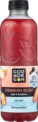 Strawberry Delight er en frisk og søt bærblanding med smak av eple og jordbær. God Morgen® DELIGHT serien har 30 % mindre sukker. Det har ikke gått på kompromiss med smaken, takket være kokosvann. Kokosvann inneholder minimal mengde fruktsukker og ved å b
