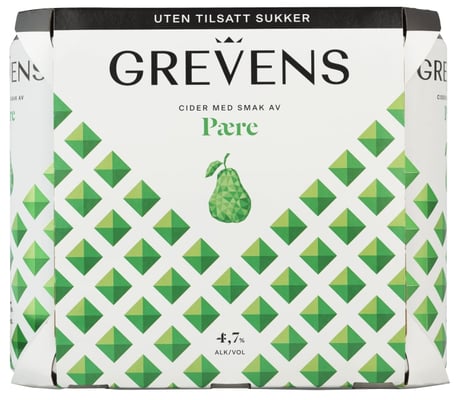Grevens Pærecider uten tilsatt sukker er en halvtørr, fruktig og musserende vinbasert drikk. Den inneholder 20 % ekte juice, men har færre kalorier og karbohydrater enn vanlig pærecider.