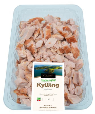 Kjøtt av kylling fra Ytterøy, vann, salt, glukosesirup (mais), antioksidant (E301, E331), stabilisatormiks (E407a, E508) , fortykningsmiddel (E412)