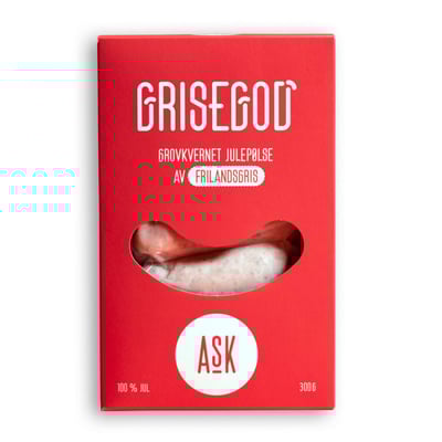 GRISEGOD er en grovkvernet, saftig og smakfull julepølse laget av frilansdgris. Helt uten kunstige tilsetningstoffer.