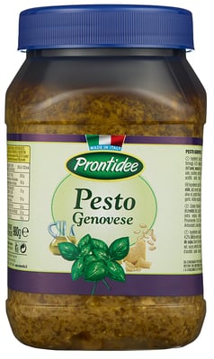 Basilikum (51%), solsikkeolje (25%), ost (MELK, salt, løpe, lysozym fra EGG )(4,2%), CASHEWNØTTER, ekstra virgin olivenolje, potetstivelse, salt, sukker, gjærekstrakt, pinjekjerner (0,5%), hvitløk, surhetsregulerende middel (E 270 melkesyre), antioksydant (E 300 l-askorbinsyre)