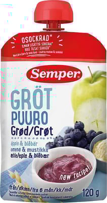 Grøt med Blåbær & Eple Fra 6 mnd, 120 g fra Semper Produktet er tilgjengelig hos Oda til en pris av 24.00 kr. Vekten er 120 g. Produktet leveres av Bonaventura Sales AS. Produktet ble første gang registrert 9.1.2022 og sist oppdatert 6.10.2023. Prisen har endret seg fra 23.30 kr til 24.00 kr over tid.
