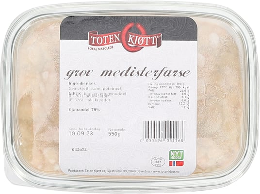 Grov Medisterfarse 550g Toten Kjøtt fra Toten Kjøtt Vekten er 550 g. Produktet inneholder følgende allergener: Melk. Produktet leveres av TOTEN KJØTT AS. Produktet ble første gang registrert 11.6.2023 og sist oppdatert 6.9.2023.
