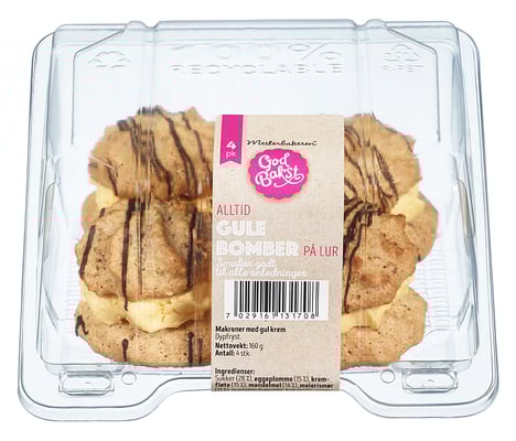 Sukker (28 %), eggeplomme (15 %), kremfløte (15 %), mandelmel (14 %), meierismør (fløte, salt, syrekultur, vitamin d) (11 %), margarin (11 %) (rapsolje, kokosolje, vann, fullherdet rapsolje), salt, emulgator (E 471), naturlig aroma, farge (E 160a), surhetsregulerende middel (E 330)), eggehvite (7 %), kakaomasse, kakaosmør, emulgator (E 322 (soya)), vaniljearoma.