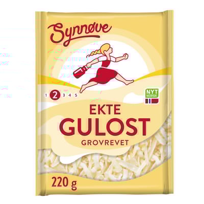 Revet ost hever de fleste retter! Synnøve Grovrevet Gulost passer perfekt til de retter hvor du bruker revet ost, som feks pizza, taco, lasagne, pasta, nachos, horn, paier, gratenger og gratinering. Smaken er den samme gode og milde som du kjenner igjen fra vår Synnøve Gulost. Vi har gjort hverdagen enklere for deg og gir deg en praktisk forpakning som har hele 65% mindre plast per pakke enn tilsvarende produkter i beger. Synnøve Gulost revet er dessuten laktosefri og rik på protein. Pakket i beskyttende atmosfære.
