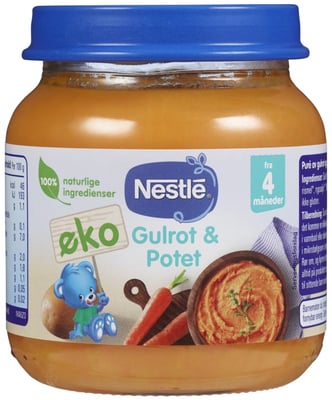 Nestlé Øko middagsglass med gulrot og potet er en næringsrik og enkel oppskrift for små smaksløker. Perfekt som tilvenning til fast føde eller som mellommåltid fra barnet er 4 måneder. I tillegg er denne også glutenfri og inneholder 100% naturlige ingredienser. Vi sørger alltid for at maten er næringsrik og trygg for små barn. Vi tilpasser oppskriftene våre slik at konsistensen og porsjonsstørrelsen passer alderssteget og vokser med barnet. Våre måltider er laget av nøye utvalgte, økologiske og bærekraftige ingredienser. Barnematglassene er produsert med 100% fornybar energi ved vår lokale nordiske fabrikk i Åbo i Finland.