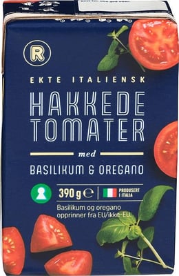 Hakkede Tomater Basilikum 390 g fra REMA 1000 Produktet er tilgjengelig hos Oda til en pris av 13.00 kr. Vekten er 390 g. Produktet leveres av Rema 1000. Produktet ble første gang registrert 9.1.2022 og sist oppdatert 7.10.2023. Prisen har holdt seg stabil på 13.00 kr.