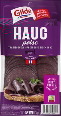 Haugpølse skivet 150g Gilde fra Gilde er et produkt innen Pålegg & frokost, Spekemat, Spekepølser. Produktet er tilgjengelig hos Joker til en pris av 57.90 kr. Vekten er 150 g. Produktet leveres av Nortura sa g. Produktet ble første gang registrert 9.1.2022 og sist oppdatert 6.10.2023. Prisen har holdt seg stabil på 57.90 kr.