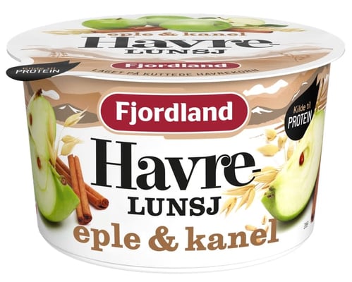 Fjordland Havrelunsj Eple og Kanel er et mellommåltid laget på kuttet havre. Vi har brukt Fjordland Havregrøt som base og pisket inn 10 % fløteblanding for å få en deilig luftig konsistens. I sidekammeret finner du syltetøy med eple og kanel. Kommer med skje og kan enkelt spises på farten.