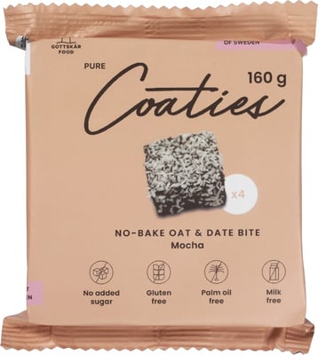 Havreterninger Mocca glutenfri 160g Coaties fra Coaties er et produkt innen Bakeri, Kaker, Havreterninger. Produktet er tilgjengelig hos Meny til en pris av 44.10 kr. Vekten er 160 g. Produktet leveres av Jonassen & co. Produktet ble første gang registrert 9.1.2022 og sist oppdatert 6.10.2023. Prisen har endret seg fra 49.00 kr til 44.10 kr over tid.