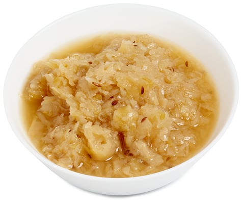 Strimlet hodekål 67% i en frisk lake av vann, råsaft eple 5% (laget av konsentrat), sukker, eddik, salt, konserveringsmiddel (natriumbenzoat), fortyknignsmiddel (guarnkjernemel), karve, krydder, naturlig aroma, konsistensbevarer (kalsiumklorid), fargestoff (E150c).