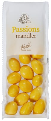 Hvit sjokolade, (78%): sukker, kakaosmør, søtmelkspulver (MELK), mysepulver (MELK), laktose (MELK), emulgator (SOYA lecitin), naturlig vaniljearoma, overflatebehandlingsmiddel (Shellak), glukosesirup, modifisert tapiokastivelse, vegetabilsk olje (kokos, raps) i variabelt mengdeforhold), mandler (20%), konsentrert pasjonsfruktjuice (1%), surhetsregulerende midler (eplesyre, natriummalat), pasjonsfruktaroma, safflorekstrakt.