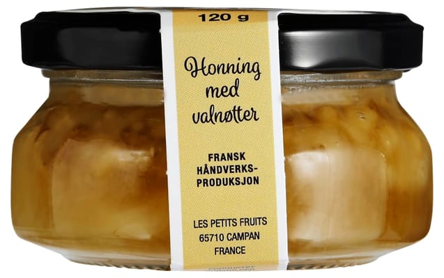 Førsteklasses appelsinblomsthonning tilsatt valnøtter. Denne kombinasjonen er veldig god til alle typer ost.