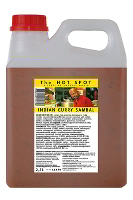 Vann, løk, paprika, tomatpuré, røde bønner, sukker, rapsolje, salt, hvitløk, rosiner, chili pepper, ingefær, koriander, svart pepper, spisskummen, eddik, maisstivelse, gurkemeie, tamarind, fennikel, nellik, SENNEPSFRØ, smaksforsterker (E621), surhetsregulator (E330), konserveringsmiddel (E202, E211)