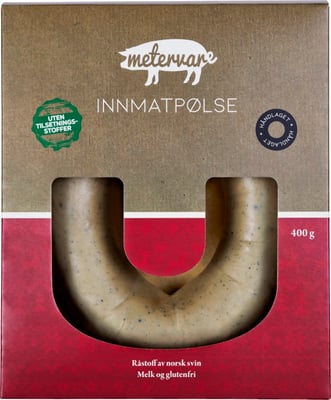 Metervare sin Innmatpølse er laget på norsk svinekjøtt, svinelever og svinehjerte, og er møysommelig smakt til med nellik og muskatnøtt. Innmatpølsen er håndlaget på tradisjonelt vis og er uten kunstige tilsetningsstoffer. Innmatpølsa vår er også glutenfr