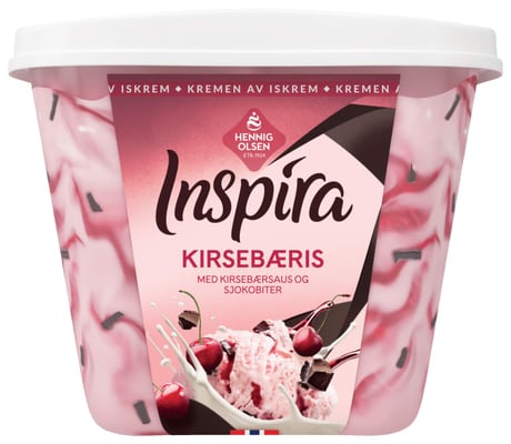 Inspira Kirsebæris er premium fløteis med kirsebærsaus og sjokoladebiter. Perfekt som dessert til selskap.