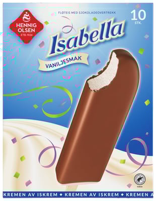 Isabella 10pk er fløteis med vaniljesmak og sjokoladeovertrekk. Til glede for alle nostalgikere som elsker klassisk fløteis med sjokoladetrekk. Litt som i gamledager – enkelt og godt.