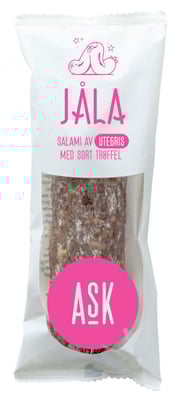 Jåla er en snobbete salami med hvitvin og sort sommer trøffel fra Piemonte. Vellagret og moden, med perfekt balansert smak. En vinner på pizza, til ost eller nyt den som den er. Laget av norsk utegris, ingen kunstige tilsetningsstoffer eller nitrit.