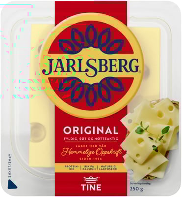 Jarlsberg® er verdenskjent for sin fyldige, litt søtlige og nøtteaktige smak og sine store hull. Osten med den hemmelige ingrediensen har vært laget av TINE siden slutten av 50'tallet. Osten er ferdig skivet og pakket i en praktisk åpne-lukkepakning som bevarer den gode smaken. Jarlsberg® løfter smaken - uansett underlag. Som de fleste faste hvite oster er Jarlsberg® laktosefri.